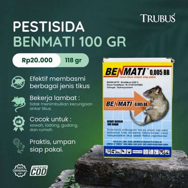 Benmati adalah pestisida berbentuk umpan racun yang efektif untuk membasmi tikus di area pertanian, rumah, dan gudang. Mengandung bahan aktif yang bekerja lambat, membuat tikus tidak menyadari efek racun sehingga tidak menimbulkan rasa jera pada koloni lainnya.